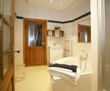 Mit Dusche, Badewanne und Waschtisch ist das Badezimmer ausgestattet.